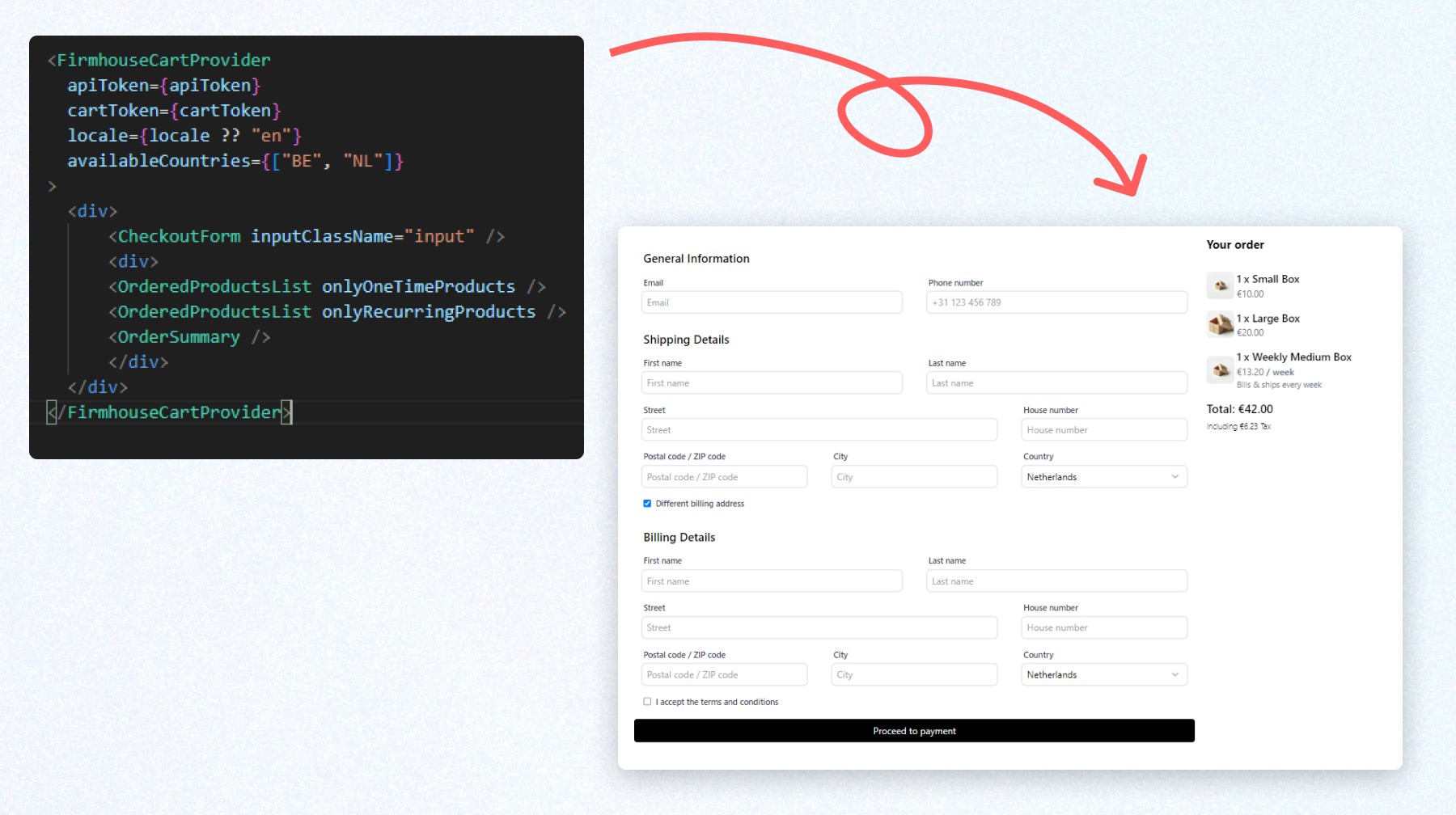 We’ve just launched a set of headless React components that make it super simple to build custom checkout pages on top of Firmhouse. That means you no longer have to wrestle with API calls, form validation, or price calculations. Instead, we take care of it all.