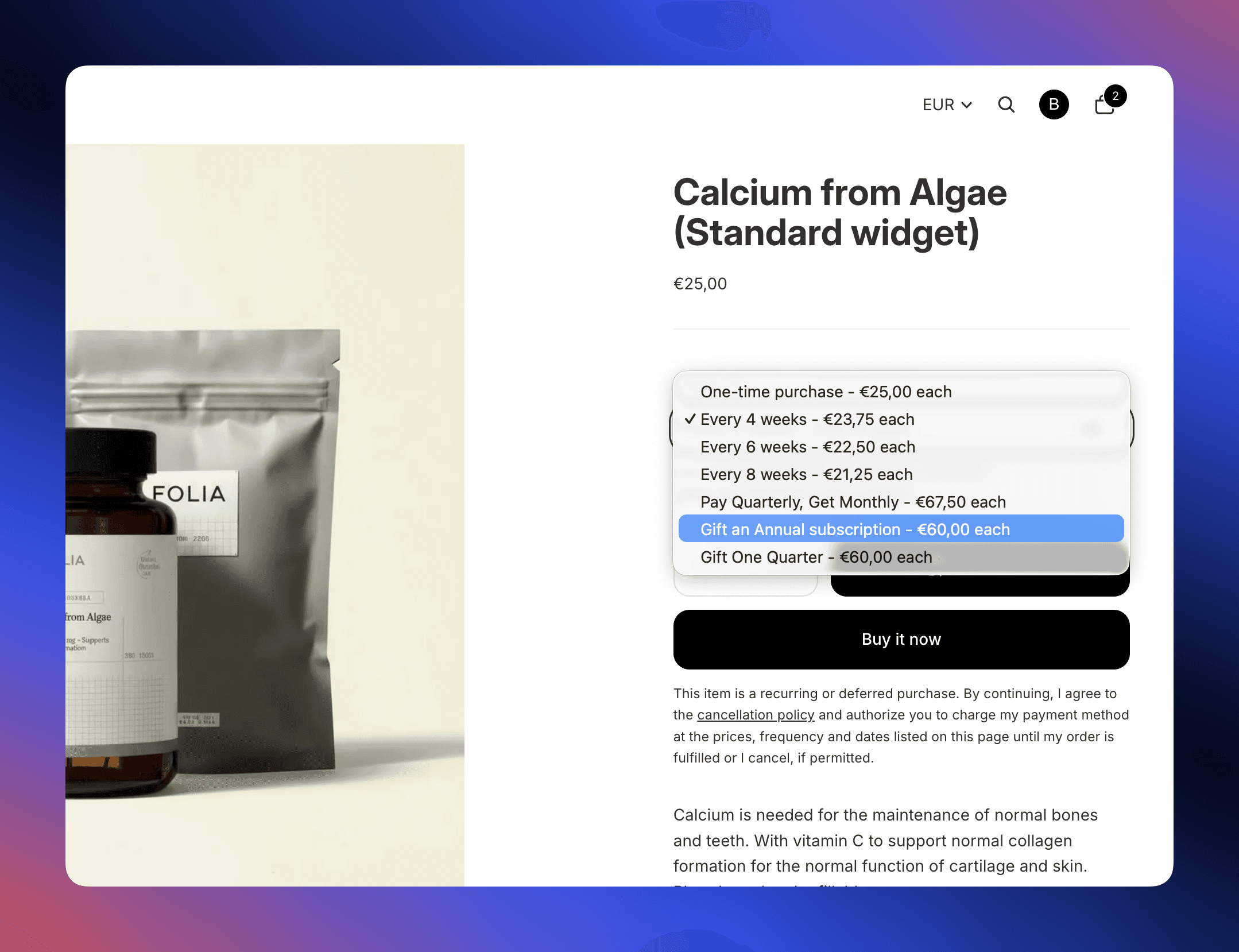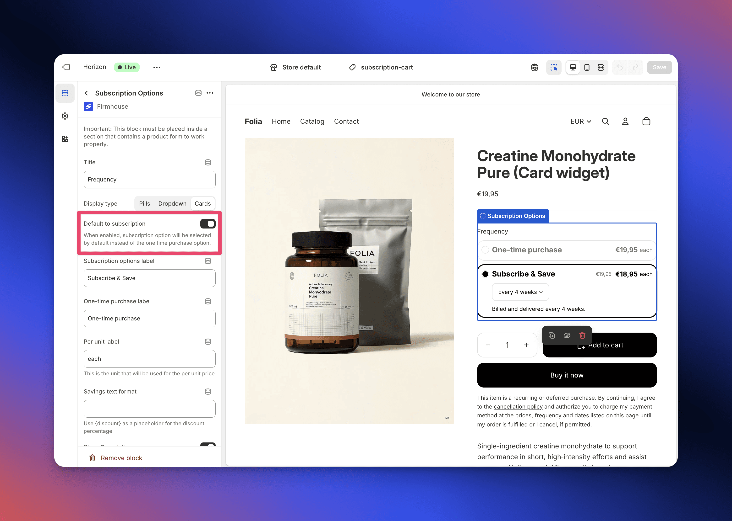 We’ve added a “Default to subscription” toggle in the settings of our Shopify Subscription Options theme block. This automatically selects the subscription option as default to add to the cart instead of the one time purchase option.