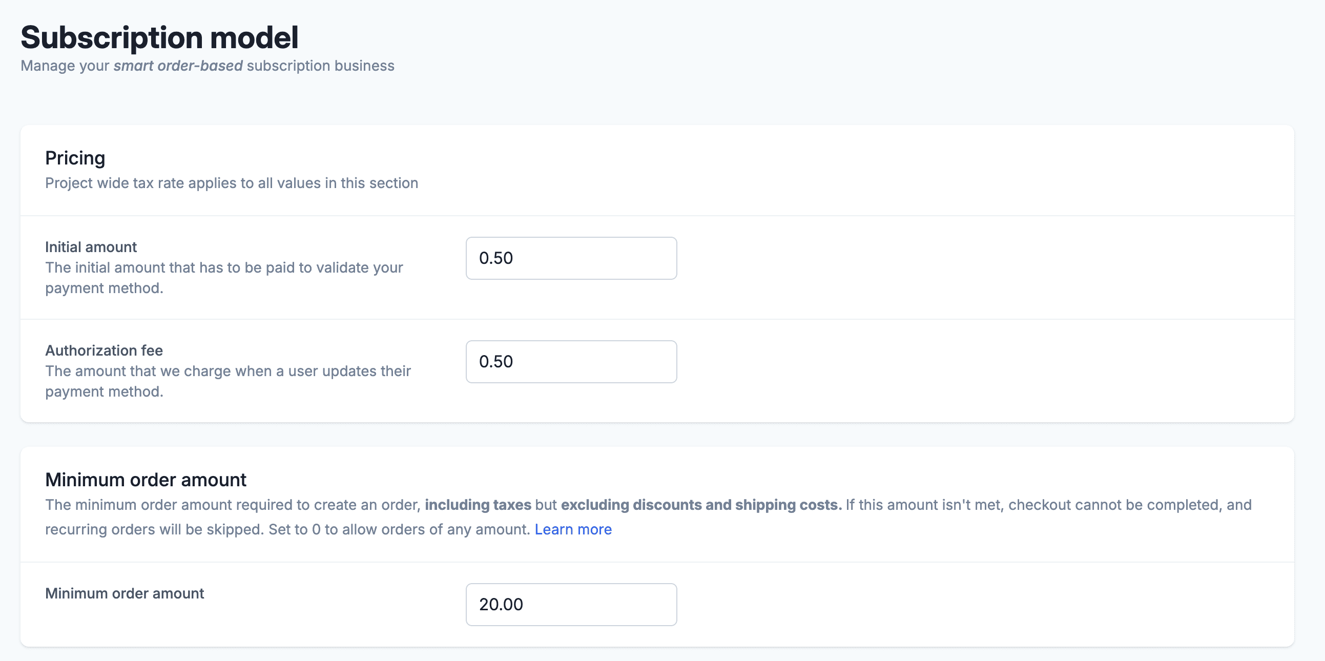 Find minimum order amount: Once in the Subscription Model section, locate the field labeled Minimum Order Amount.