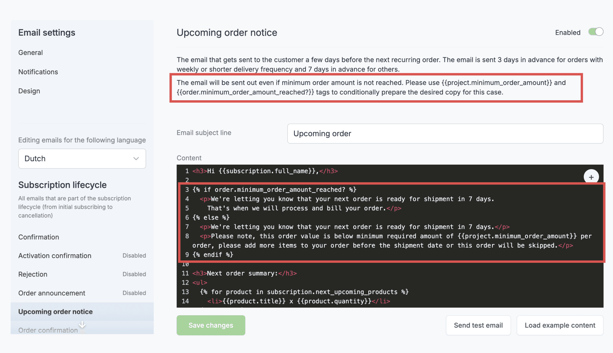 {{project.minimum_order_amount}}and{{order.minimum_order_amount_reached?}}, you can customize these emails to remind them to adjust their order to meet the required amount.Smart order-based projects: This feature is only available for smart order-based projects.