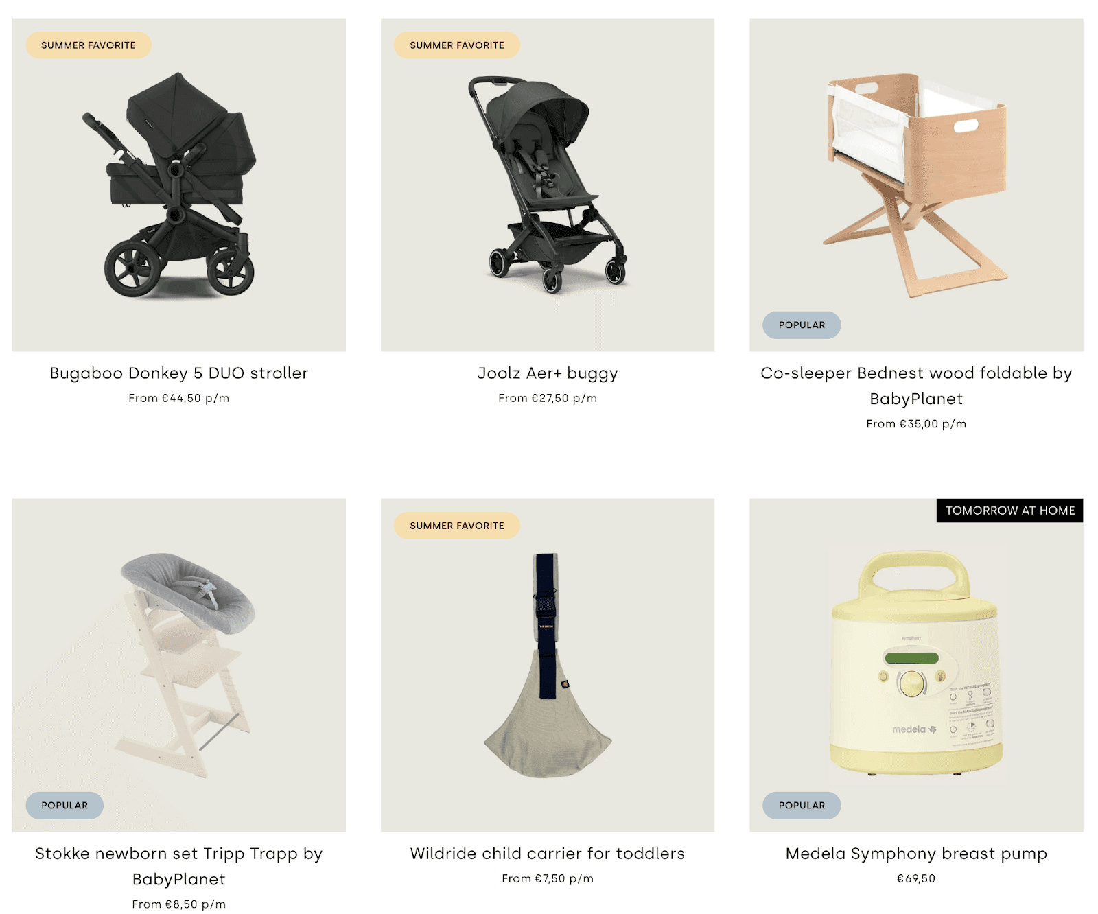 Take, for instance, Tiny Library, one of our first clients and a pioneer in the baby goods space. The business rents out strollers, car seats, and other baby products that families use for a relatively short time. Shoppers can rent a wide range of products from multiple brands in one place and can easily return items as kids grow out of them. This sustainable commerce model offers flexibility and convenience for families.