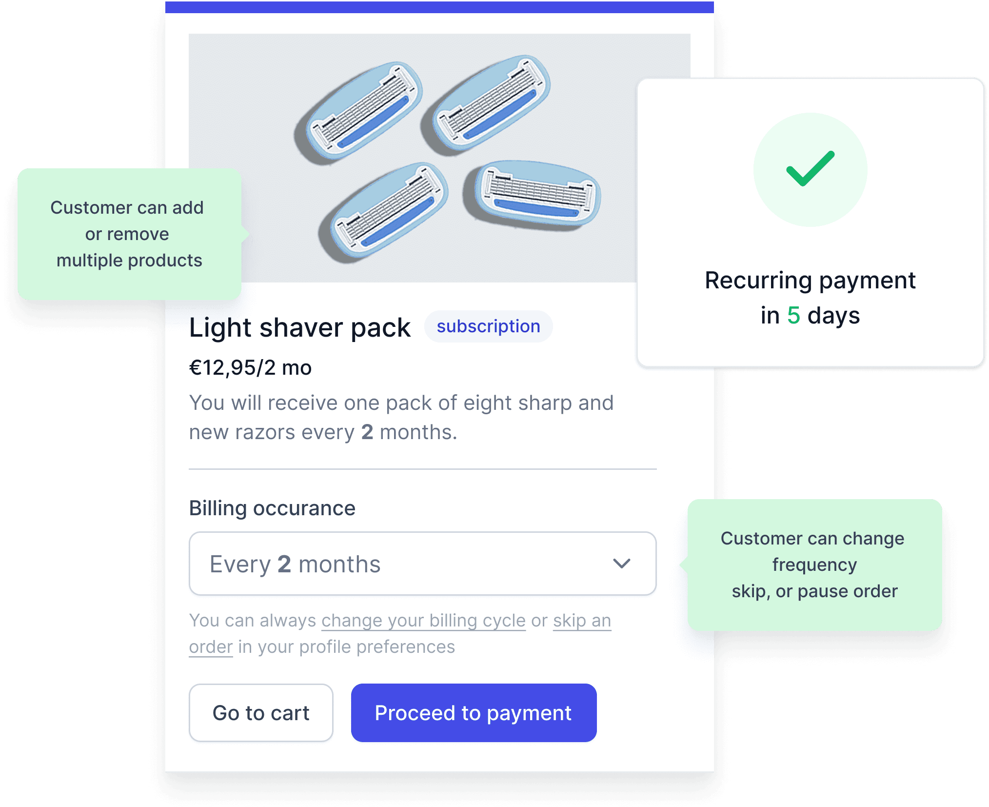 With our billing and shipping logic fully separated, you gain the freedom to choose exactly how, when, and where customers are charged, fully independent from shipping logic. This makes any recurring model a breeze to set up.